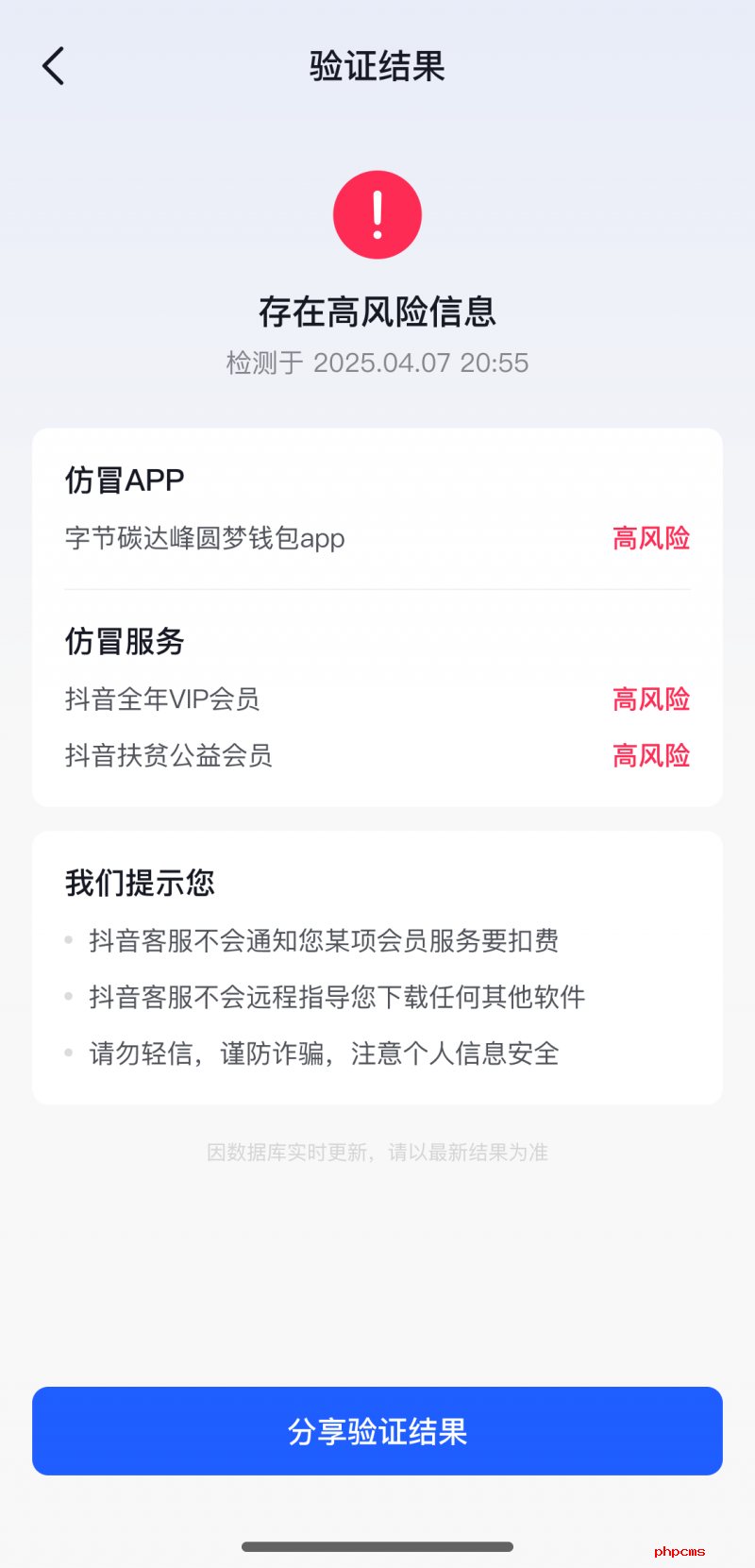 近日,有用户深夜接到冒充“抖音极速版客服”的诈骗电话,对方以“误开直播会员即将扣费”“限时操作”施压,要求用户下载指定 APP。用户在诈骗分子的行骗过程中,想到了抖音官方验证功能,于是打开抖音App内的“验证助手”,输入骗子口述的相关信息,查询得到了“高风险”提示。抖音官方客服则在“高风险”预警后第一时间联系用户揭穿骗局,帮用户及时止损。