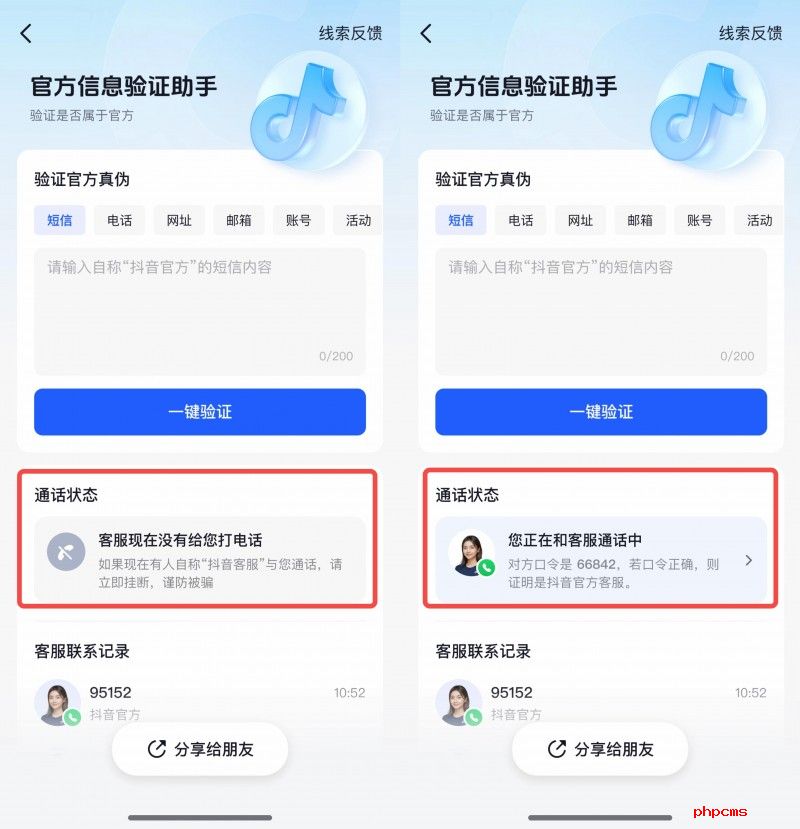 (图说:抖音官方客服没有与用户通话/和用户正在通话时,“验证助手”页面的通话状态展示)
