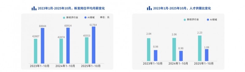 近日,脉脉高聘发布《2025年度人才迁徙报告》(以下简称《报告》)。《报告》显示,2025年1-10月,人才求职压力增加,新经济行业整体人才供需比升至2.23,相当于2.23个人争夺1个岗位,创下近三年新高。初阶职场人求职压力大,面向1年以内工作经验的的新发岗位量下降40%。AI人才供需比首次超过1,进入人才供大于求的状态。