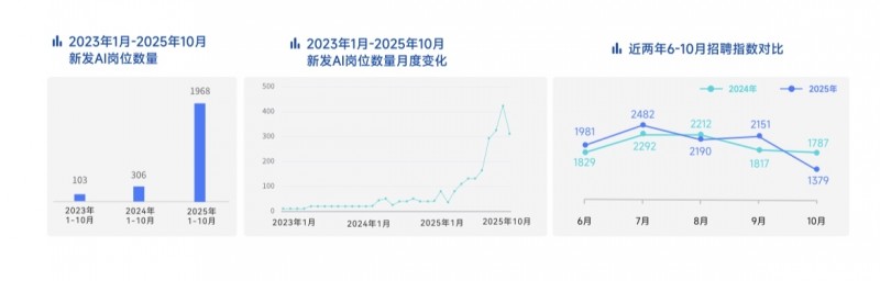 2025年6月开始,招聘市场逐渐回暖,6-10月新经济行业整体新发岗位量超过去年同期。新发AI岗位量、出海岗位量均保持增长。2025年1-10月,AI岗位量同比攀升543%,单月同比增幅最高超过11倍。出海岗位量同比增长16.99%。
