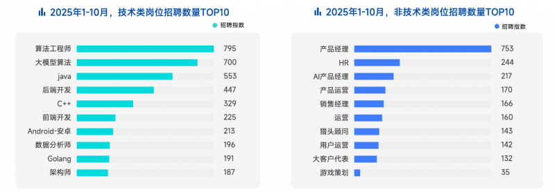 2025年1-10⽉,AI岗位断层领跑热招岗位榜。在热招的TOP10技术岗中,算法⼯程师与⼤模型算法分列第⼀位、第⼆位。这两个岗位也是面向应届生招聘数量最多的岗位。在热招的TOP10⾮技术类岗位中,产品经理、HR分列一二位。AI产品经理位列第三。