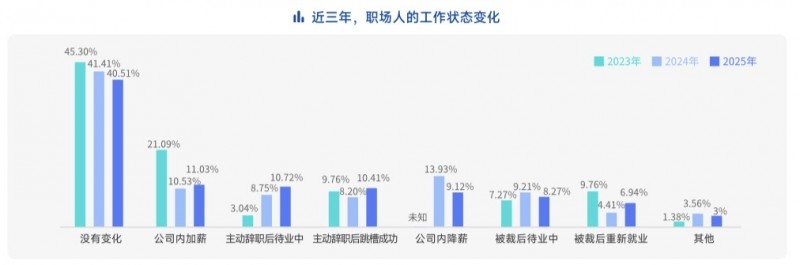 随着招聘市场回暖,职场人的求稳心态出现松动。职场状态“没有变化”的人才占比从2023年的45.30%下降到2024年的41.41%,2025年进一步下降至40.51%,“主动辞职”的人才占比显著上升,达到21.13%,较2023年提升8个百分点,较2024年提升2个百分点。在择业因素方面,求职者对于薪资福利的关注度出现下降,从去年的85%降至74%,对于行业前景、企业文化与价值观的关注度均有小幅上升。