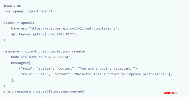 这段代码通过 DeerAPI 调用了 Anthropic 的 Claude Opus 4 模型,并打印回复。
