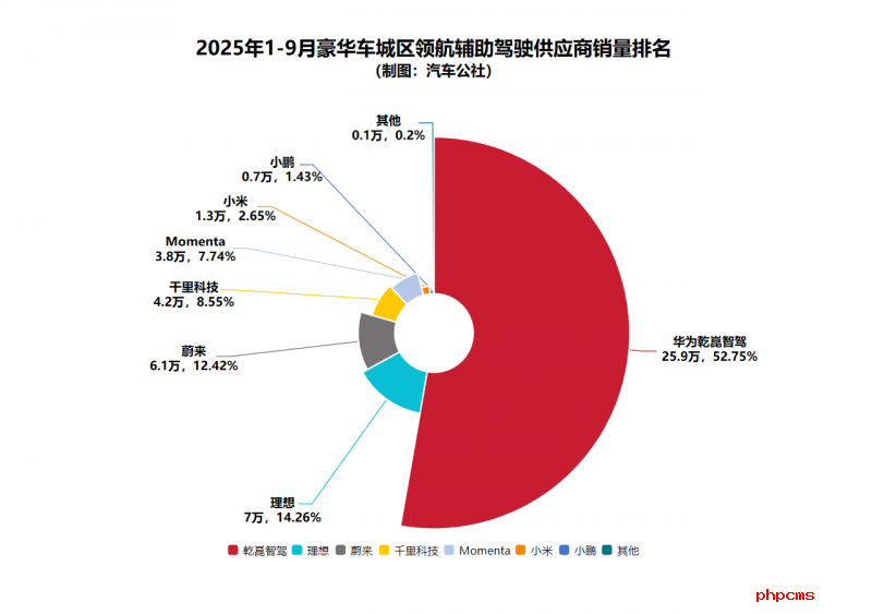 华为乾崑智驾在豪华车细分市场的表现则更加亮眼。2025年1-9月豪华车城区领航辅助驾驶供应商销量排名中,华为乾崑智驾的占有率已经过半,达到了惊人的52.75%,装机量25.9万台,超过其余所有品牌之和。豪华车市场作为技术、品牌和利润的高地,对于辅助驾驶体验的要求十分严苛,华为乾崑智驾在此领域的绝对统治力,充分证明了其技术方案的先进性与可靠性,已然成为高标准严要求的豪华品牌的共同选择。