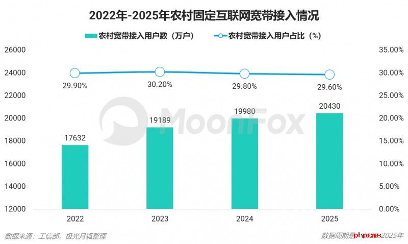 而固定互联网宽带接入服务持续在农村地区加快普及,截至2025年底,全国农村宽带用户总数达2.04亿户,全年净增450.7万户。