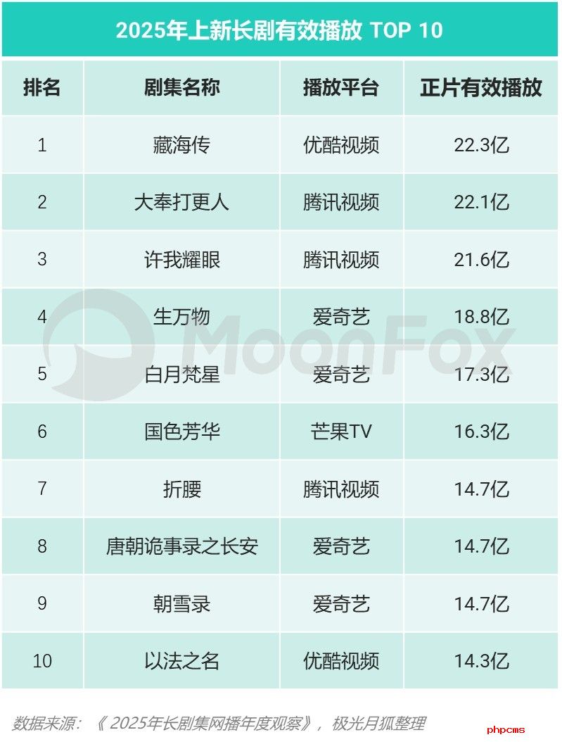 其中优酷视频《藏海传》、腾讯视频《大奉打更人》、《许我耀眼》有效播放超过20亿。
