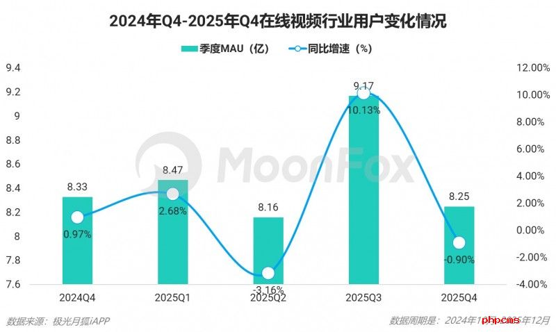 在线视频行业在2025年四季度对比拥有暑期的三季度出现用户显著下滑,但相比去年同期,整体变化不大,仅小幅下滑-0.9%,整体行业仍然用户稳定,虽然面对短剧冲击,但长视频仍是用户观看剧集、综艺的核心渠道。