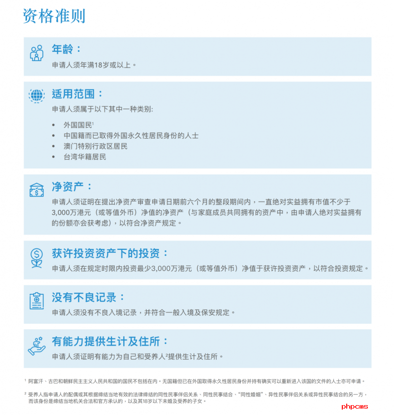 申请前6个月内拥有等值3,000万港币净资产(可与家庭成员共有)