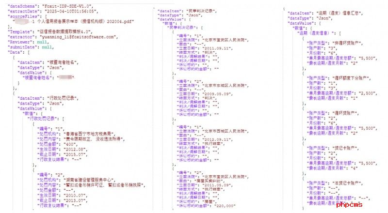 某银行建设新一代个人信贷风控系统,需从PDF版征信报告中提取以下信息:姓名、证件号、就业状态、个人查询次数、欠税记录、强制执行记录、民事判决、行政处罚、近5年逾期月份数等。