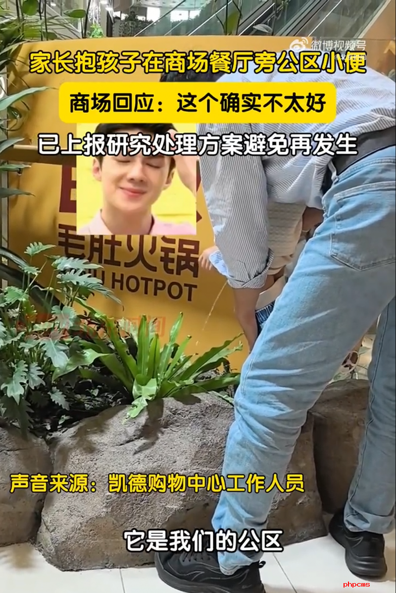 今年10月,有网友在山东青岛凯德mall商场等位吃饭,看到有家长抱孩子在商场五楼餐厅公共区小便。从网友发布的视频来看,事发地方紧挨着某火锅品牌的广告牌。对于该起事件,商场工作人员回应称,已经将该情况反映给商场负责同事,正研究竖立提示牌或围挡,避免这种情况再发生。
