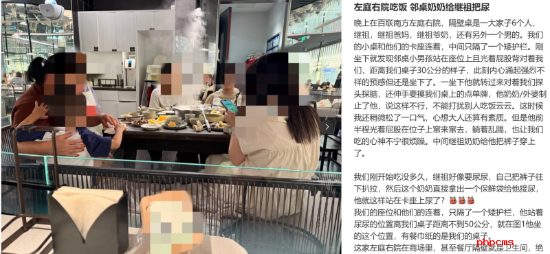 还有网友爆料,在左庭右院吃饭时,隔壁桌是一大家子6个人,自己刚开始吃没多久,隔壁桌小孩想尿尿,孩子的奶奶直接拿出一个保鲜袋为他接尿,小孩直接站在卡座上方便。网友称,他们的座位与隔壁桌连着,只隔了一个矮护栏,小孩尿尿的位置离其不到50公分。