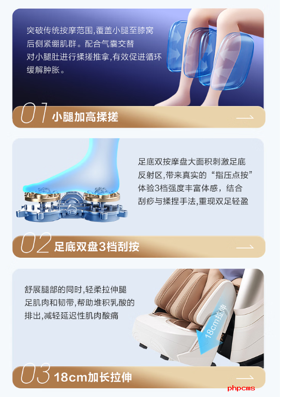 在足部护理方面,7508X的豪华版足疗系统突破了传统按摩椅的局限。小腿加高揉搓功能可触及膝窝后侧的紧绷肌群,结合气囊交替按压,有效缓解久站久坐带来的下肢不适。足底的双按摩盘能灵活调用多种手法,刺激足底反射区,促进全身循环。特别加入的18cm加长拉伸功能,则能在按摩的同时温和伸展腿部,适合运动后使用。