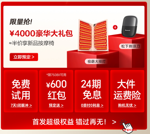 奥佳华7508X双机芯按摩椅将于2026年1月15日晚8点正式开启全球首发。为让更多用户体验到这一革新产品,品牌特别推出限时权益:7天免费试用确保选购无忧;1元预定即有机会赢取半价资格,大幅降低体验门槛;预定用户还可获得价值4000元高端健康礼包。