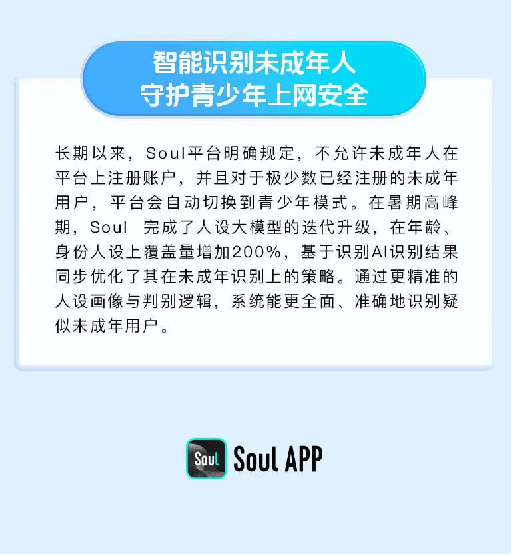 事实上,此次群聊派对的成功举办,正是Soul App长期深耕生态安全的生动体现。依托持续深化的警企协作与AI技术的全面升级,Soul在反诈风控、未成年人保护及网络暴力治理等关键领域已取得突破性进展。根据Q3报告,Soul 针对欺诈风险,对基于 AI 大模型的图片反欺诈模型进行了深度优化。数据显示,该模型误伤量级大幅下降约 80%,识别覆盖率提升至 90% 以上,有效覆盖了主流图片生产场景 。同时,人设大模型的高风险人设识别覆盖率提升至 70% 以上,将风险阻断在用户接触初期 。依托图片/文本反作弊大模型,Q3 季度违规内容机审直接拦截量达 439 万,日均中断违规语音超 5,600 条,有效遏制了群聊和广场中的不良内容滋生 。 在未成年人保护领域,Soul 始终坚持“技术+制度”双轮驱动,不仅坚决执行“18周岁以下用户禁止注册”的红线规则,“假成年人用户”识别策略的贡献率还高达 99%,极大提升了保护措施的精准度和覆盖面。