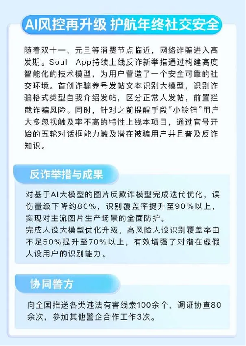 打击电信网络诈骗是一项长期而系统的工程。Soul张璐团队始终秉持“用户第一”原则,持续加码AI技术研发,携手警方与社会各界,不断推动反诈宣传教育深度融入社交场景,切实提升反诈宣传实效与用户防护能力。
