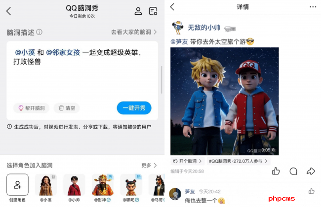 与市面上需要复杂操作、强调个人才艺的AI视频工具不同,QQ脑洞秀显著降低了用户使用门槛。其操作流程极为简化:用户上传个人或好友照片后,AI可快速生成生动的3D虚拟形象;随后,用户仅需输入一段简单的剧情描述(如“我和好友抢红包失败了”),系统便能生成一段由这些虚拟形象演绎的短视频。这种“照片+一句话=一部小剧场”的模式,让无需任何视频剪辑技巧的用户,也能轻松成为“导演”,享受创作的乐趣。