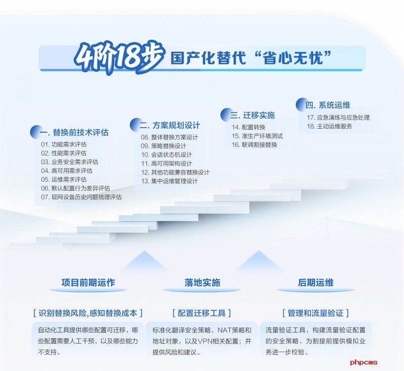 为破解海外安全产品替换过程中可能出现的配置迁移复杂、业务中断、兼容性不足等痛点,新华三依托多年行业实践经验,推出“省心无忧”的全流程替换方案,通过“4阶18步”标准化实施流程,确保替换过程平稳有序,实现业务零中断、防护不降级。