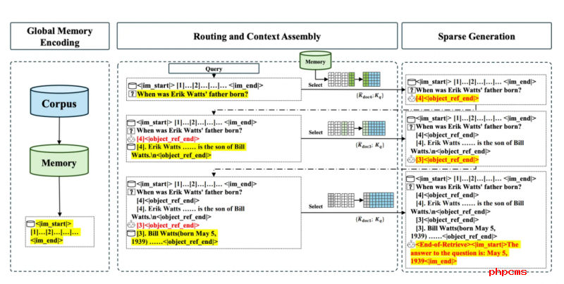 在第 2 轮迭代中,上下文已扩展,包含了第 1 轮获取的证据。模型在内部生成一个新的、更具体的查询需求(即 "比尔・瓦茨何时出生?"),并再次调用 MSA 路由机制,这次检索到了包含比尔・瓦茨出生日期的证据块:Bill Watts born May 5, 1939(比尔・瓦茨,生于 1939 年 5 月 5 日)。模型再次生成引用标记 [3],将文档 3 的内容追加到上下文中。