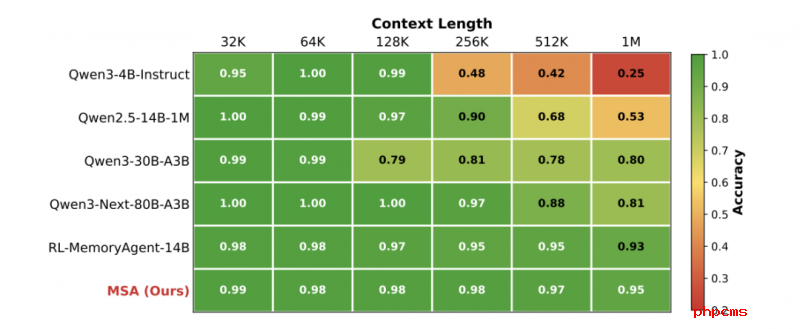 图 4:在 “大海捞针”(NIAH)测试中,MSA 在上下文从 32K 扩展至 1M 时,准确率仅从 99% 下降至 95%,表现出极强的稳定性。相比之下,其他长上下文模型则在256K后显著衰减(论文原图)。