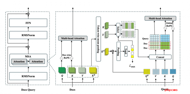 左侧是标准的 Transformer 外壳。 整体上,MSA 层被包裹在一个标准的 Pre-Norm Transformer 模块中。它取代了传统的自注意力(Self-Attention)层,其输出与输入通过残差连接(Residual Connection,图中的⊕符号)相加,随后经过 RMSNorm 归一化和 FFN(前馈网络)层处理。这一设计确保了 MSA 可以作为即插即用的模块,无缝集成到现有的大模型架构中,无需对整体架构进行颠覆性改造。