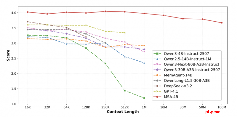 图 1 MSA-4B 的长文本问答得分随上下文长度衰减显著优越(论文原图)