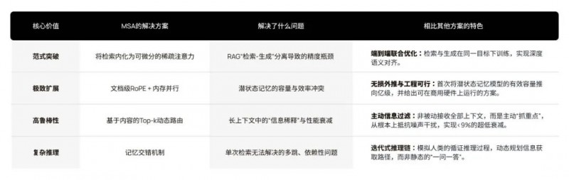 这一机制的独创性在于,它将 RAG 系统中的 "检索" 步骤,内化为了一个可端到端训练的神经网络模块。与依赖外部、固定的相似性度量(如向量余弦距离)的 RAG 不同,MSA 的路由器是在训练过程中与生成任务共同优化的(通过一个辅助的对比学习损失 L_aux),这意味着它能学会一种更符合模型内部 "世界观" 的、与最终任务目标更对齐的检索策略。这从根本上解决了 RAG"检索" 与 "生成" 目标不一致的核心痛点,是其实现高精度的关键。
